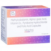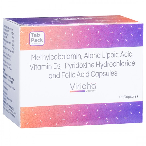 Viricha Capsule is advised to treat nutritional deficiencies and neuropathic pain associated with diabetic neuropathy. It is formulated with methylcobalamin, alpha lipoic acid, vitamin D3, pyridoxine hydrochloride and folic acid that helps to improve blood calcium levels, improve metabolism and functions of the nerves. It also promotes cell growth, cell development, repairs damaged cells and promotes blood (hemoglobin) production.