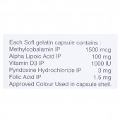 Methylcobalamin: 1500 mcg, Alpha Lipoic Acid: 100 mg, Vitamin D3: 1000 IU, Pyridoxine Hydrochloride: 3 mg, Folic Acid: 1.5 mg.