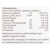 Methylcobalamin: 750 mcg, Alpha Lipoic Acid: 100 mg, Benfotiamine: 7.5 mg, Vitamin B6: 1.5 mg, Calcium Pantothenate: 25 mg, Nicotinamide: 50 mg, Folic Acid: 0.75 mg, Excipients: q.s.
