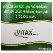 Vitax Capsule is used to treat and prevent vitamin B6 and B12 deficiencies and neuropathic pain associated with peripheral neuropathy. It is formulated with Methylcobalamin, Alpha Lipoic Acid, Benfotiamine, Vitamin B6, Calcium Pantothenate, Nicotinamide & Folic Acid, which are responsible for myelination, thus improving neural functions. It also helps to get relief from symptoms such as numbness, weakness, burning & tingling sensation, etc.