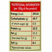 Nutritional Information- Per 100g, of product, Energy 393 kcal, Carbohydrate 49.7g, (Sugar 0), Protein 23.2g, Fat 11.1g, Salt 0.1g, Saturated Fat- 7.1 g