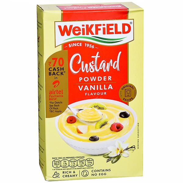 Product Information- WeikField Custard Powder Vanilla Flavour: How to Prepare: Trfle: 50g plain cake, 1pkt Weikfield Veg Jelly Crystals 1/2 ltr milk, 1-2 tbsps sugar, 4tbsp Weikfield Custard Powder and allow to cool Dissolve 1pkt Weikfiled Veg Jelly in 450 ml boiling water, Cut one slice (50g) from a plain cake Break the Slice into small pieces and set in the jelly, When the jelly is set pour the cool custard on top, Make the trifle topping with whipped cream and decorate with flaked almonds or cherries,