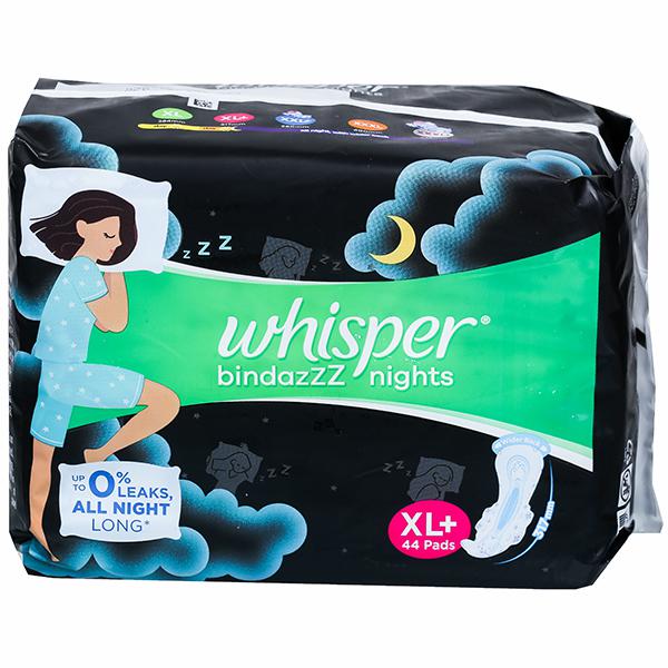 Product information- Whisper Bindazzz Nights ensures upto 0% leaks all night long. Whisper Bindazzz Nights pad is 75% longer and has a wider back so you are covered from leaks from all sides. 75% longer & wider back so you are covered from leaks from all sides.
