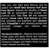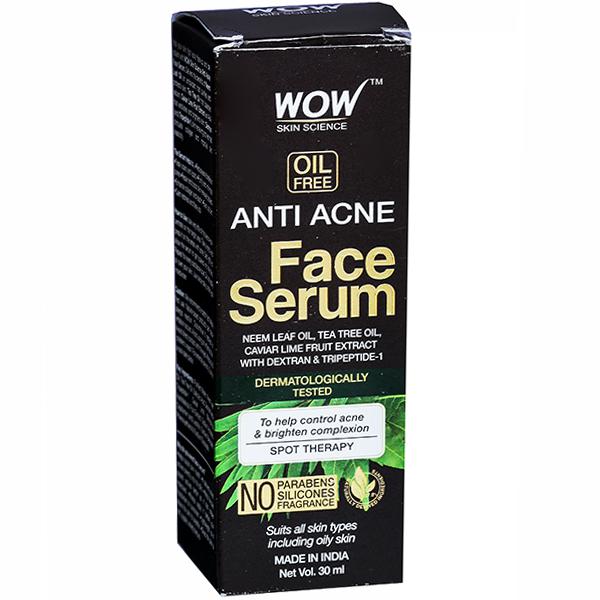 Product Information- Help your skin fight acne flare-up and be radiant with WOW Skin Science Anti Acne Face Serum. This high-active, concentrated serum delivers the benefits of Neem Leaf Oil an antioxidant that purifies and protects skin; Tea Tree Oil that balances sebum; Caviar Lime Fruit Extract an AHA that exfoliates and brightens skin; Dextran (and) Tripeptide-1, skin renewing actives that stimulate collagen and improve skin elasticity.