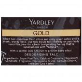 Yardley luxury perfumed talc leaves your skin feeling soft and fragrant all day. Enjoy the contemporary, elegant, sophisticated feel with the Gold range of Yardley Talc. As refreshing as ever. Designed to suit all.